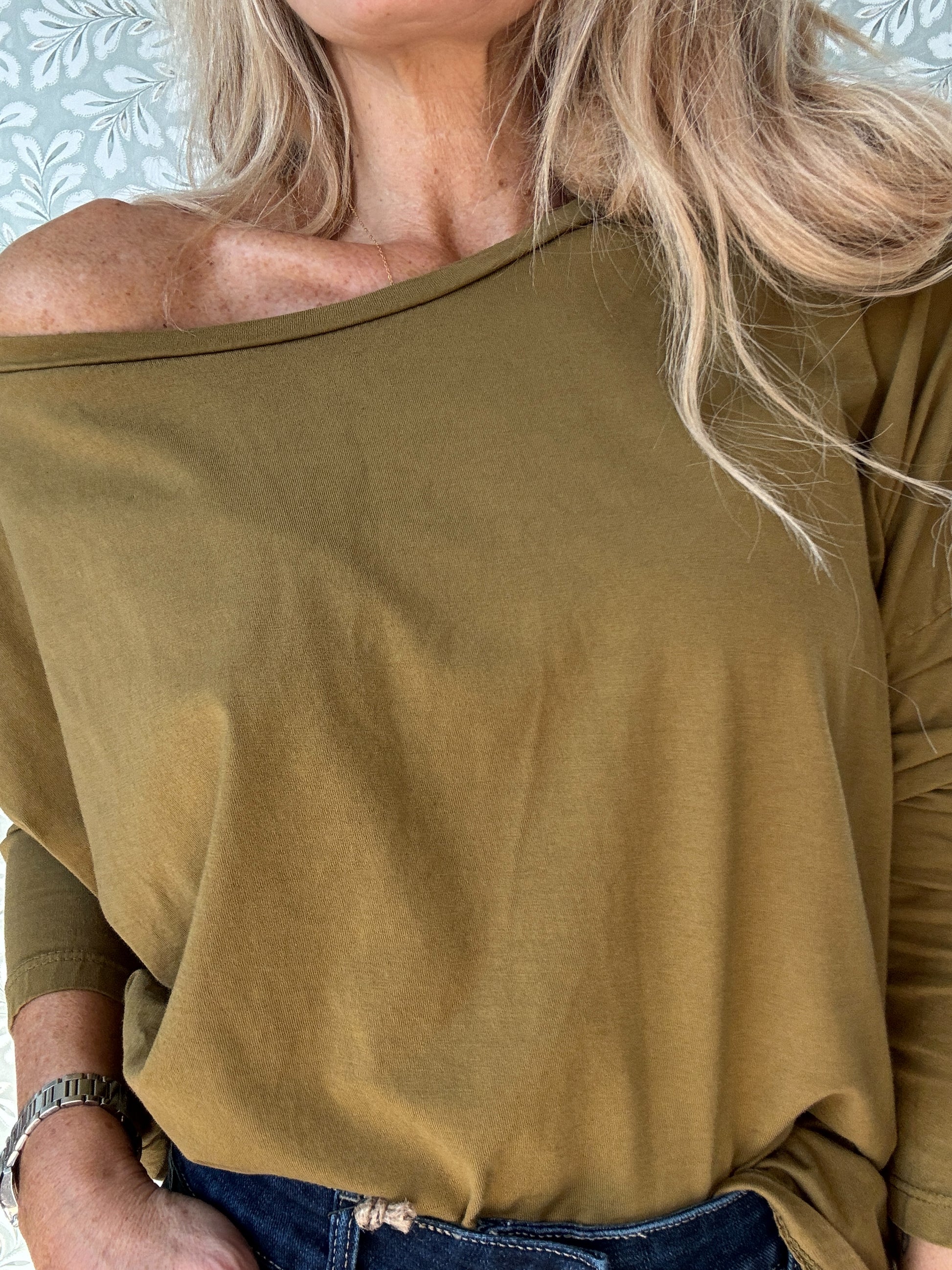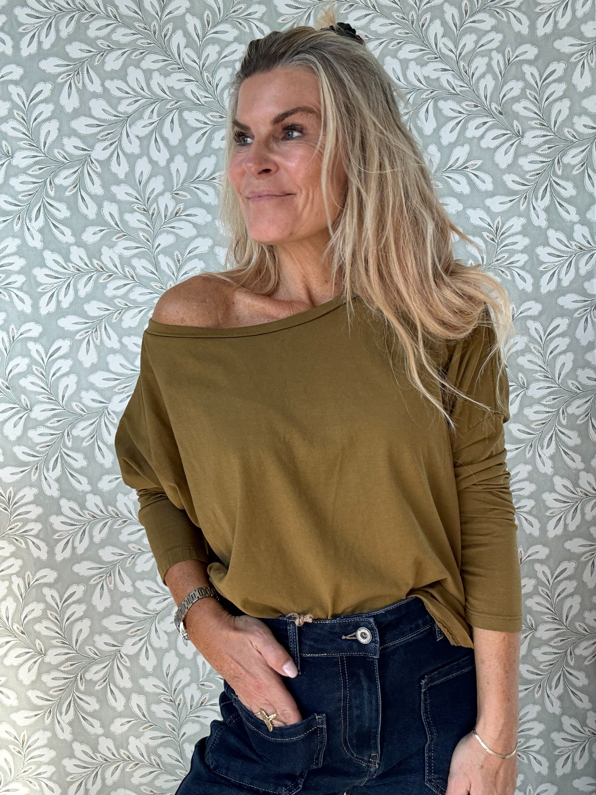 Super lækker enkel basis t-shirt som kan sættes ned over skulder eller helt almindeligt med en flot bådudskæring