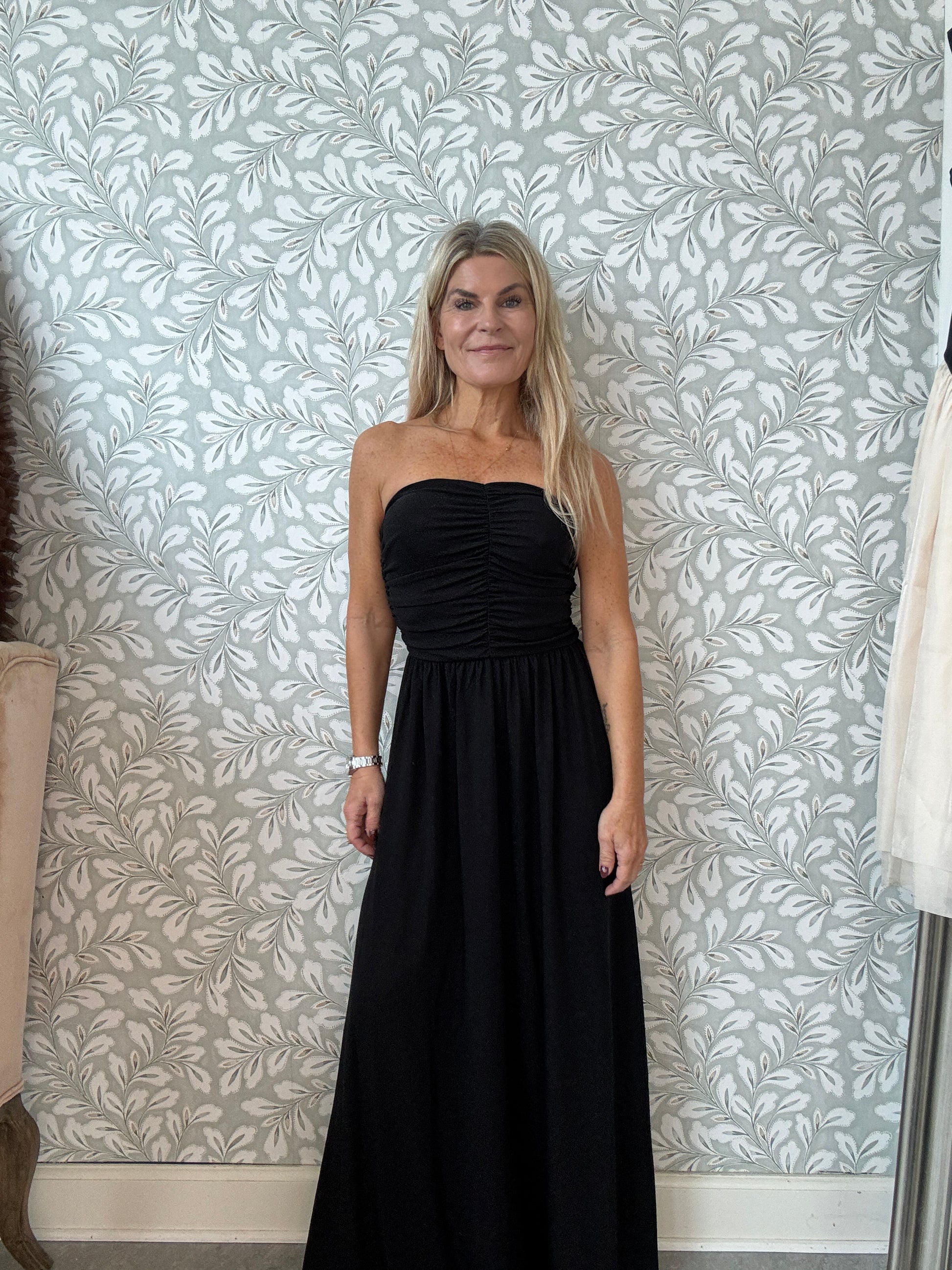 Smuk kjole i sort med lurex. Overdelen er draperet og laver en smuk shape