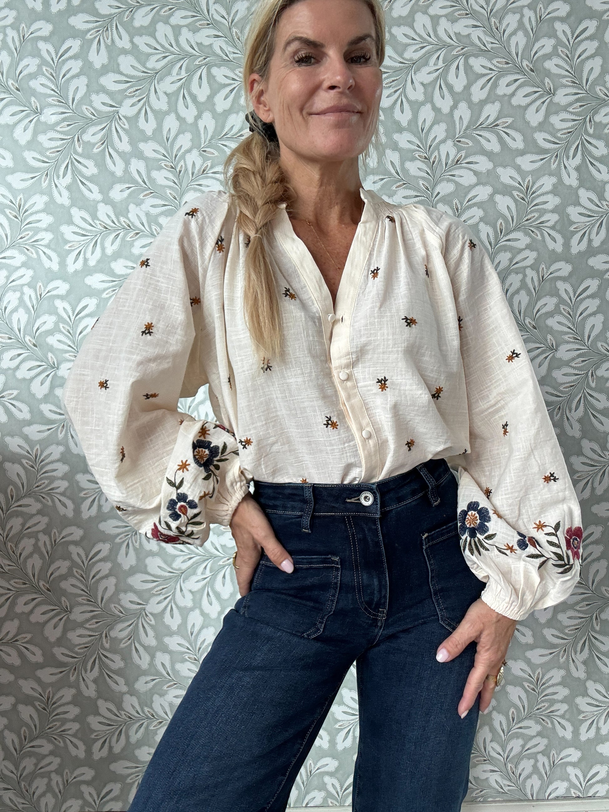 Smuk skjorte i offwhite med smukt blomsterpragt.
