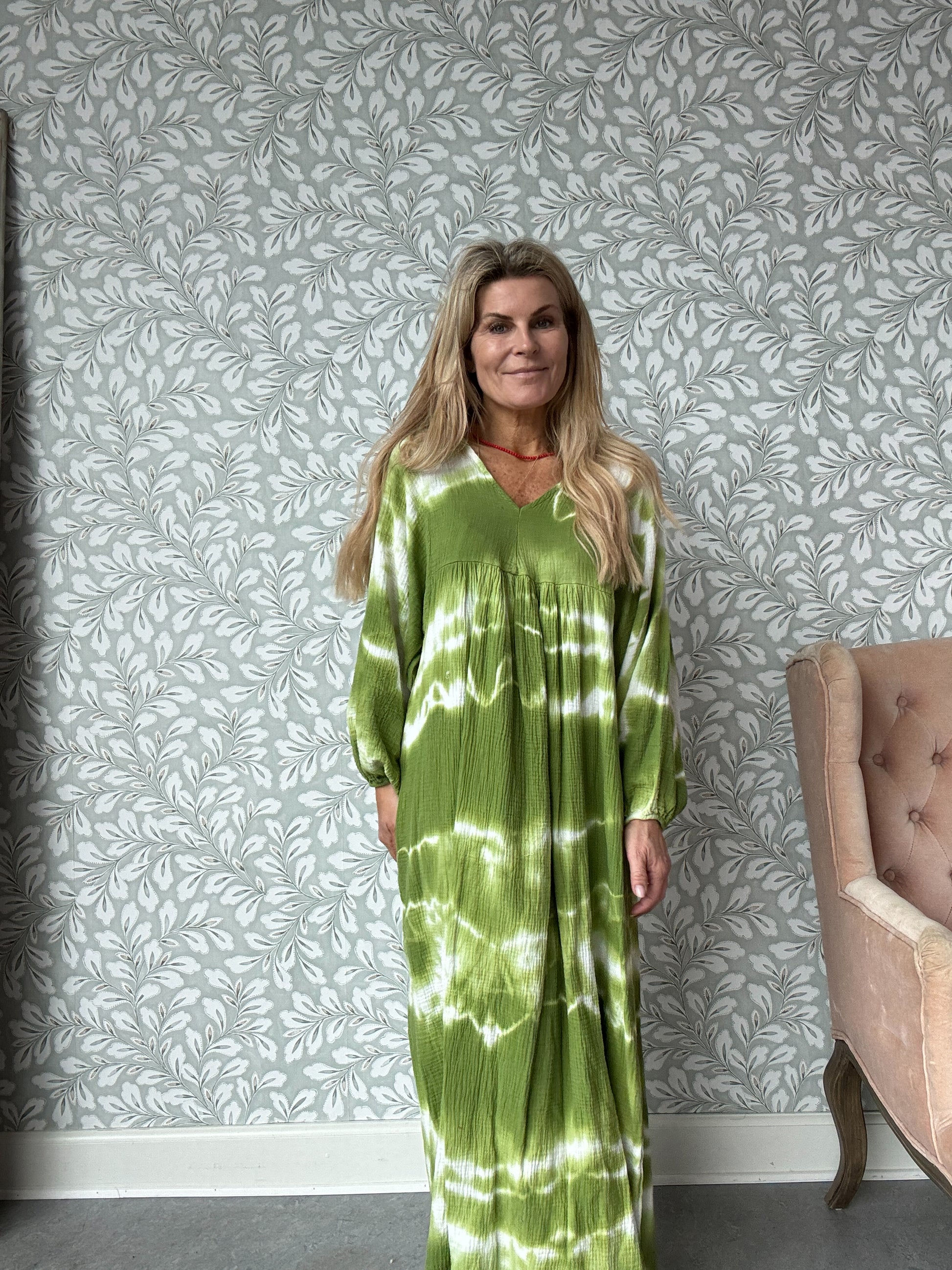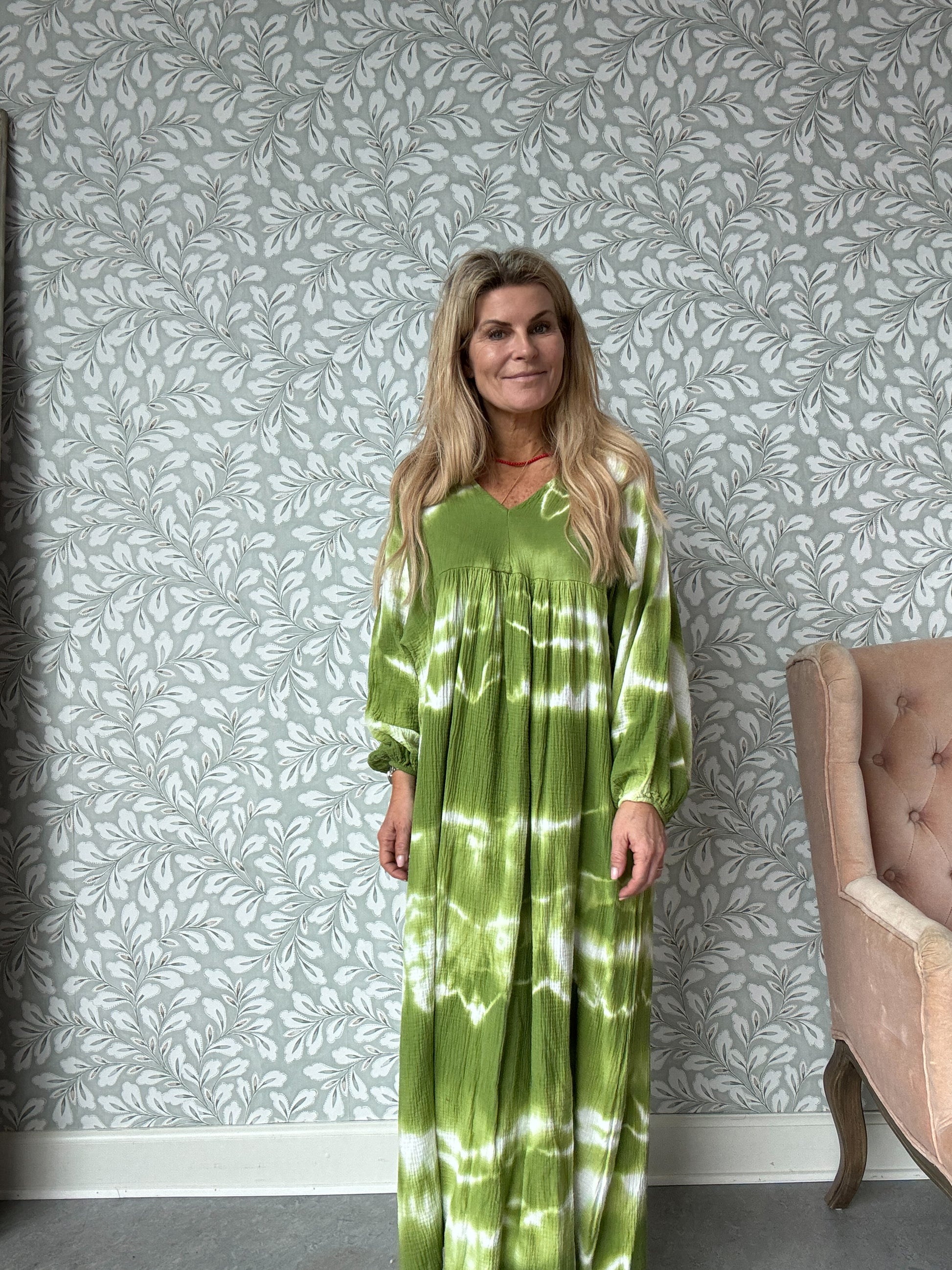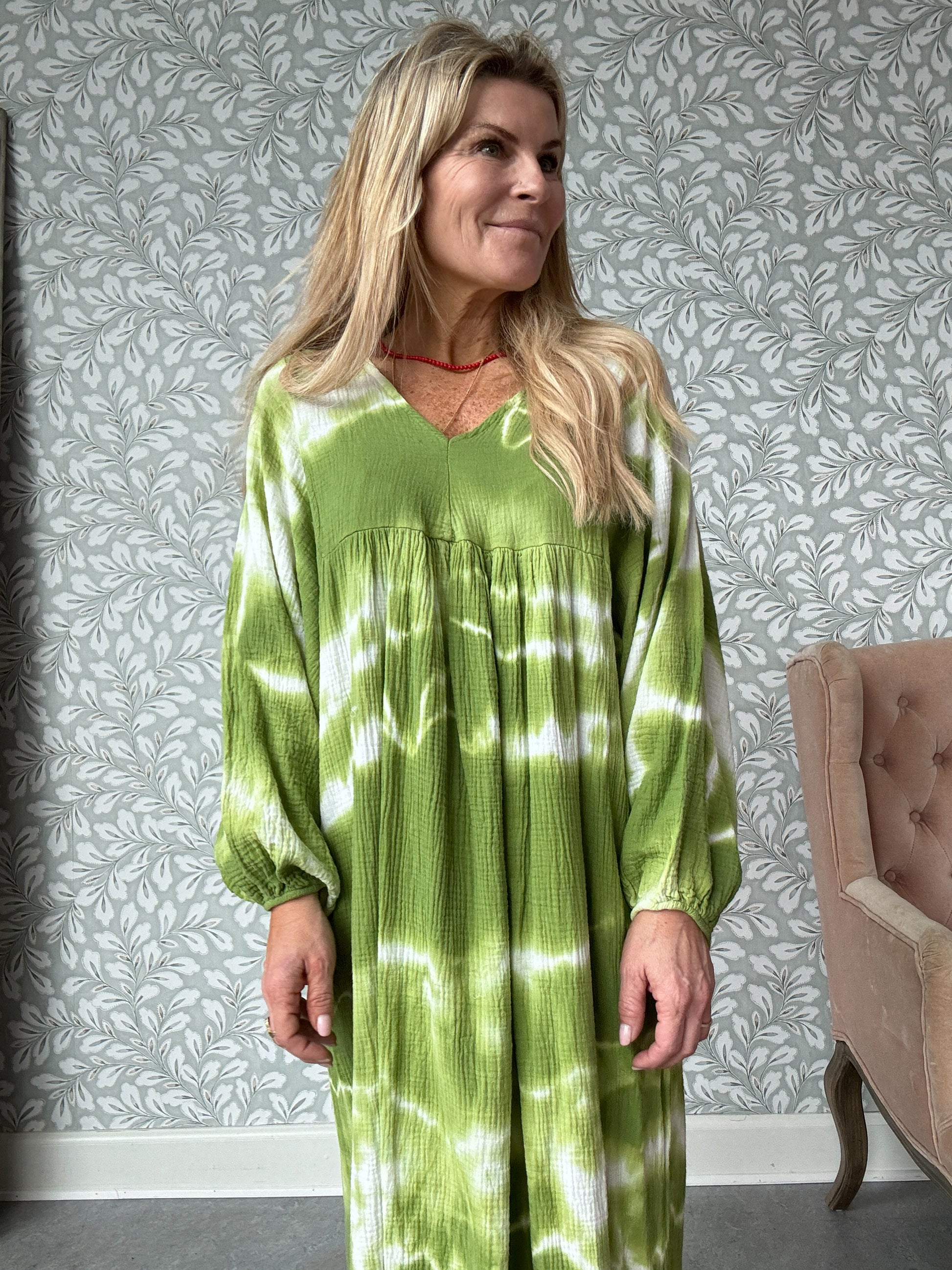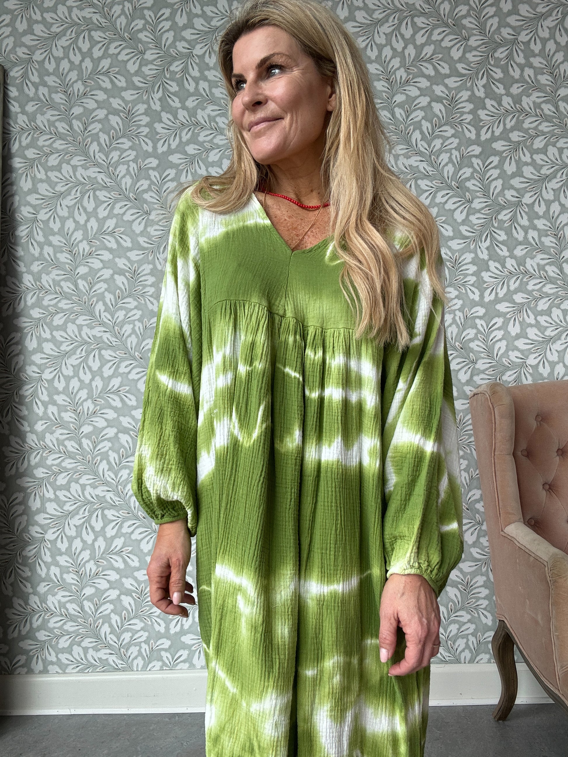 Skønneste batikkjole i en smuk græsgrøn farve.