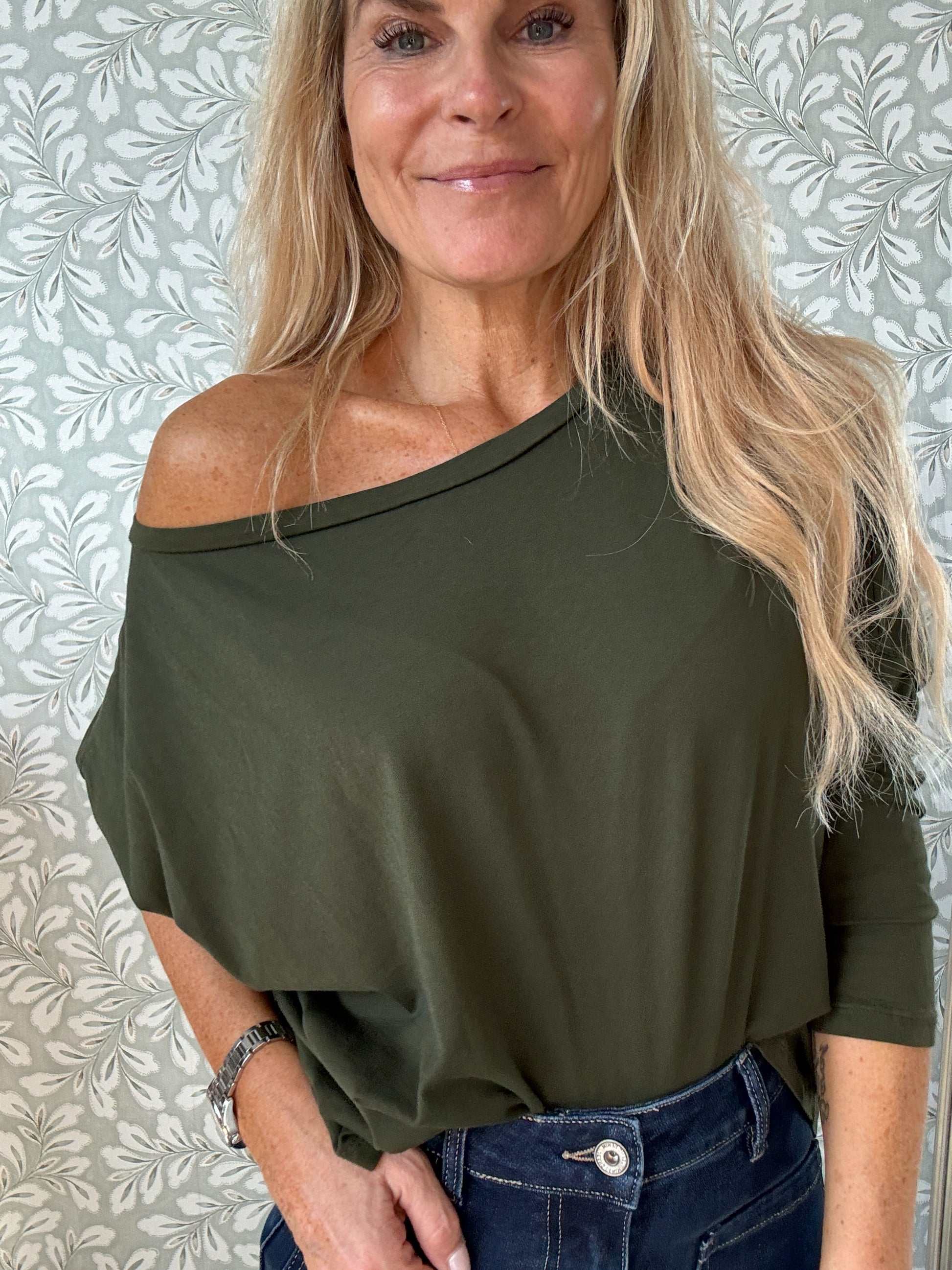 Super lækker enkel basis t-shirt som kan sættes ned over den ene skulder eller helt almindeligt med en flot bådudskæring