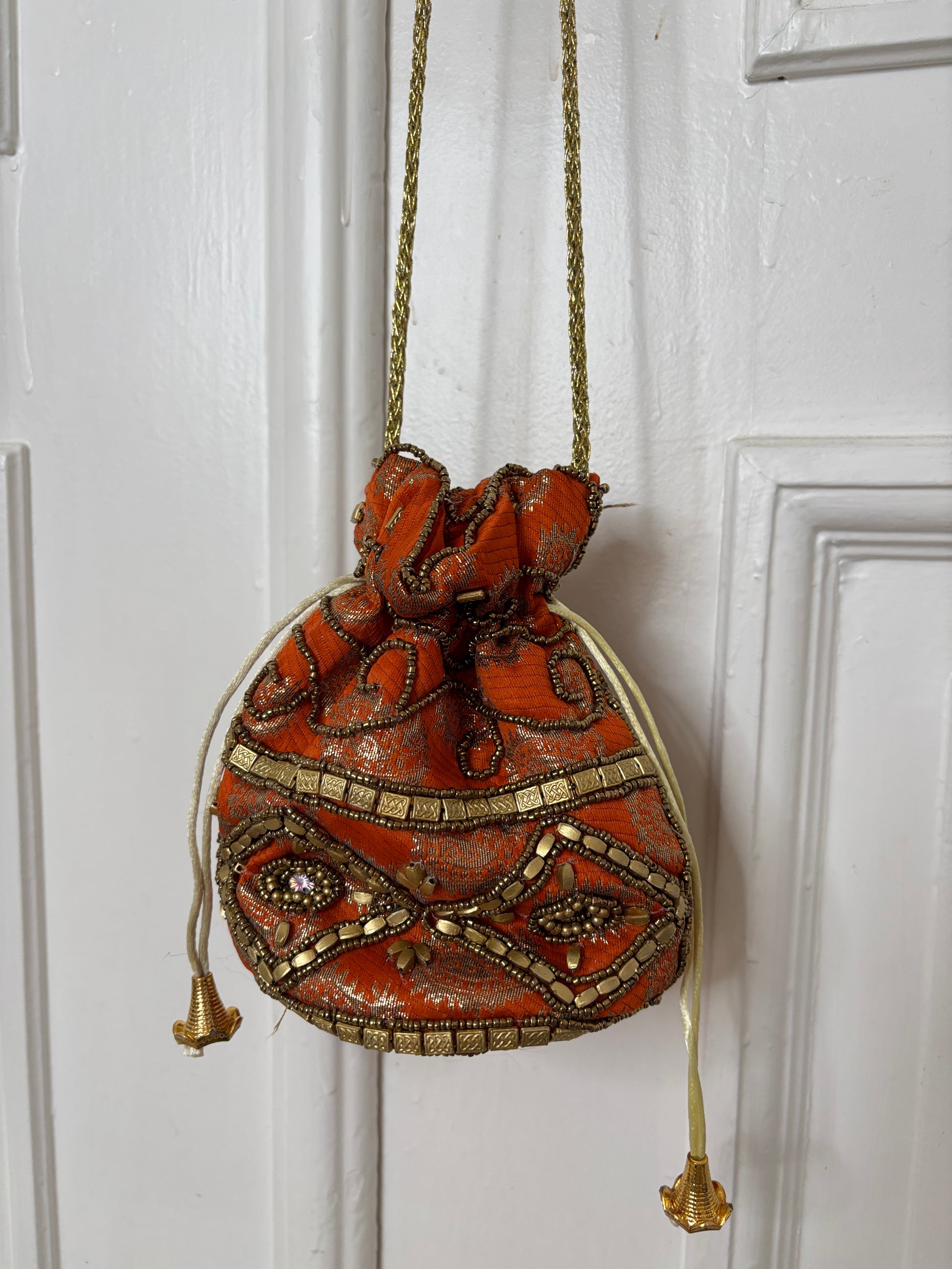 Smuk vintagetaske som er en lille mulepose. Tasken er orange og med smukke vintageperler.